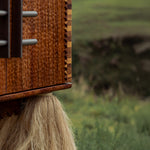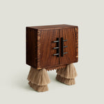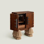 Material: Solid huanacaxtle wood. Back panel lined with mirror. Handcrafted doors and legs wrapped in henequén fiber. Handles made of carbon steel.