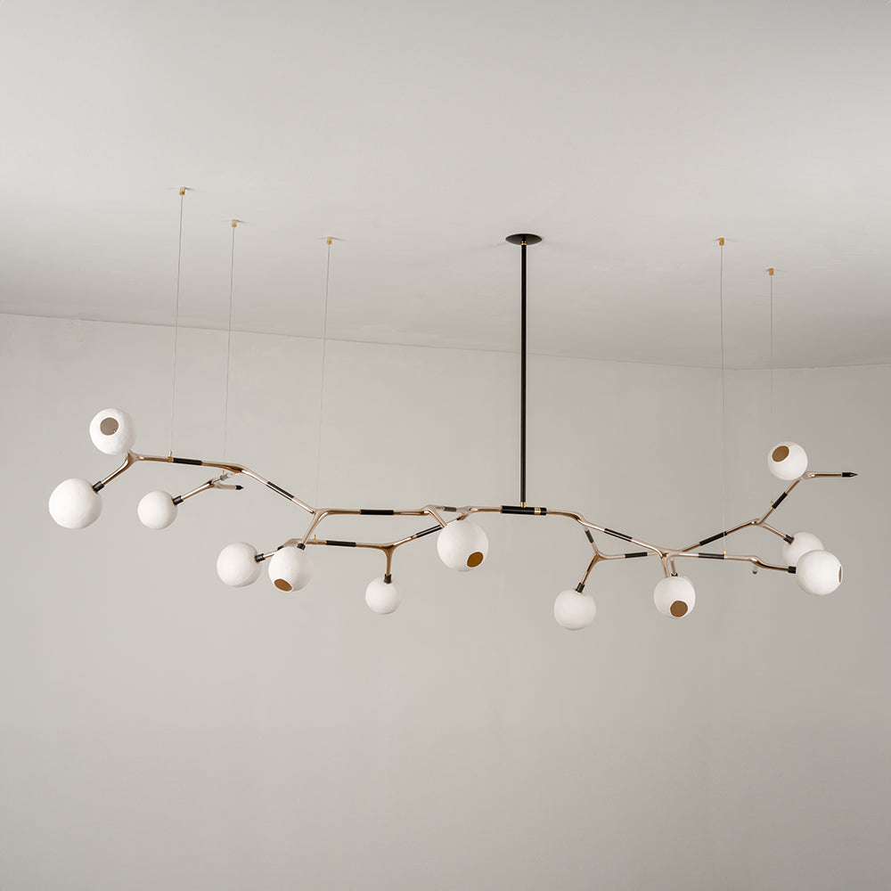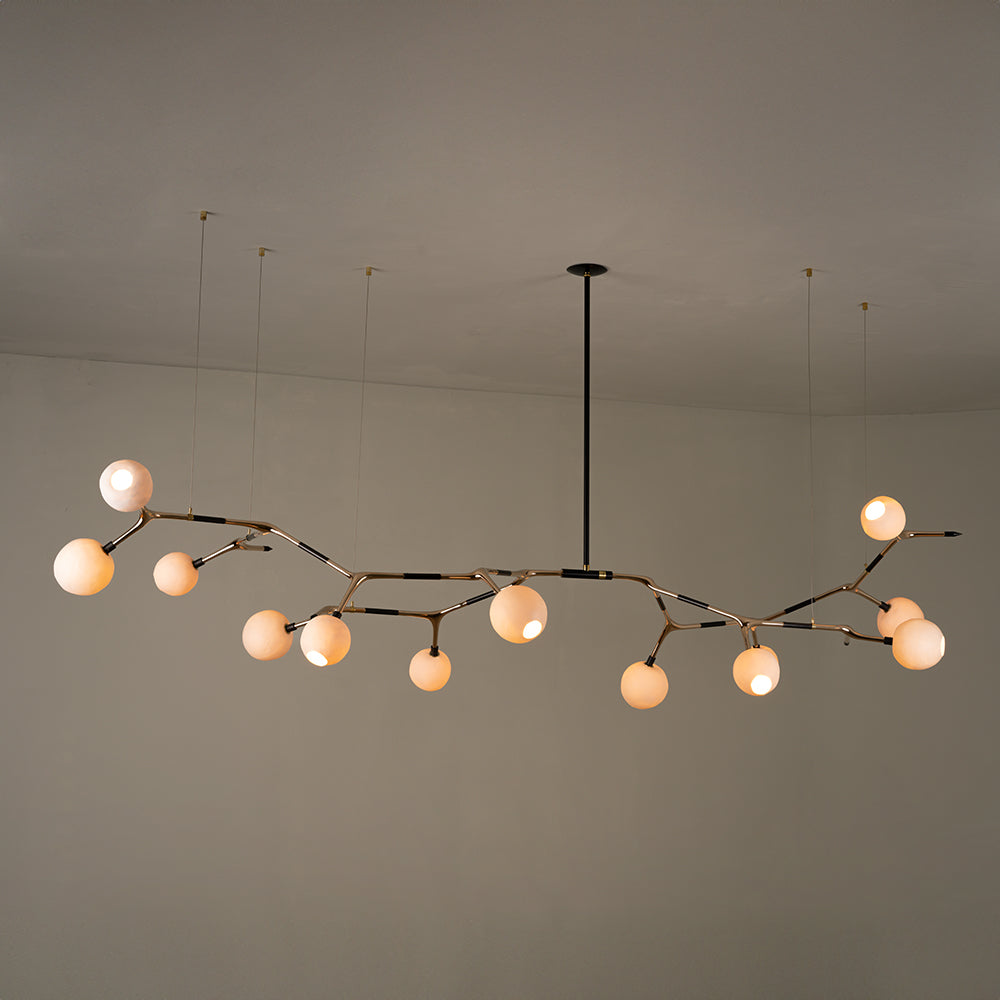 Material: Polished finish cast bronze or vintage bronze body, 13 blown glass or porcelain spheres and turned brass hardware.