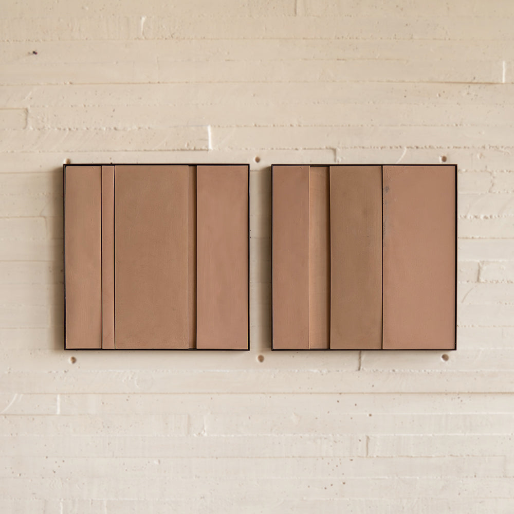 Diptych of chukum monoliths with a reticulated finish, pigmented with natural soils from Yucatán. Metal frame.