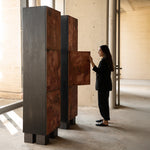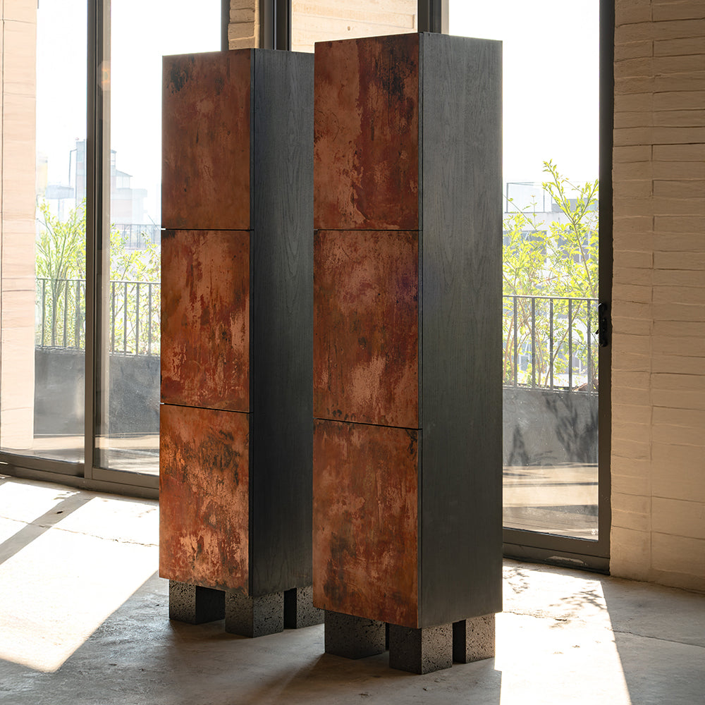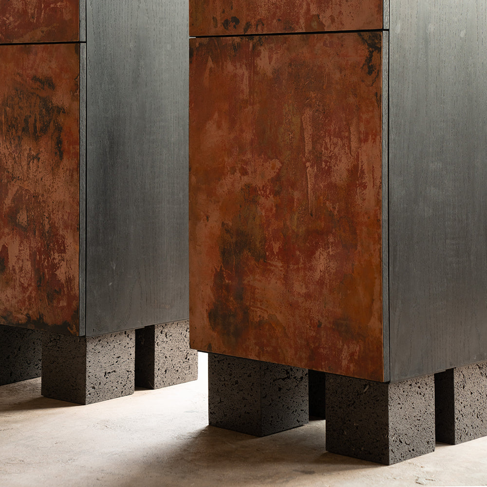 Material: Black-stained ash, volcanic stone legs and copper sheets.