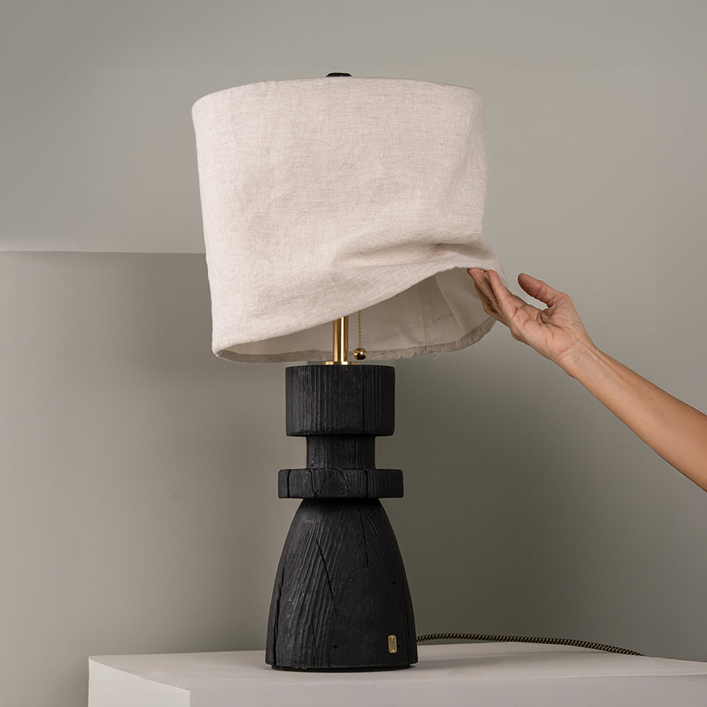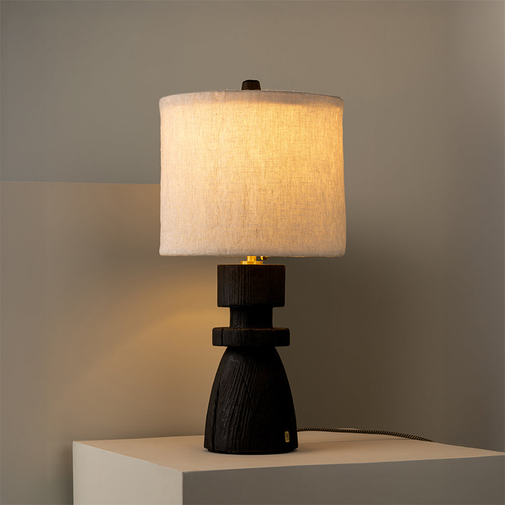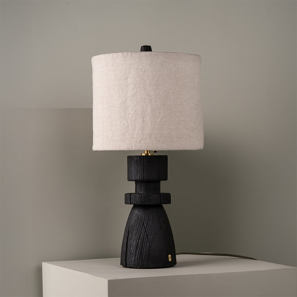 Material: Wood base with burnt finish and natural linen shade.