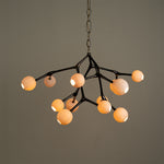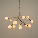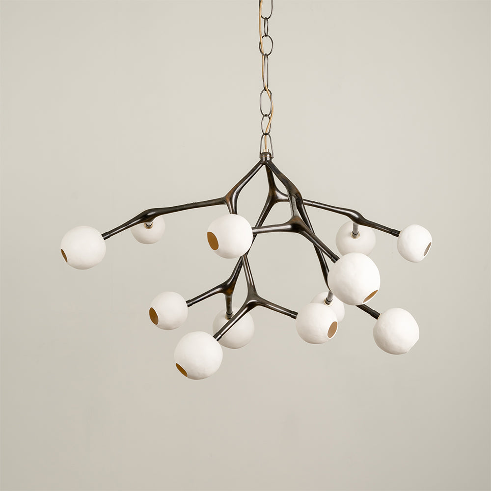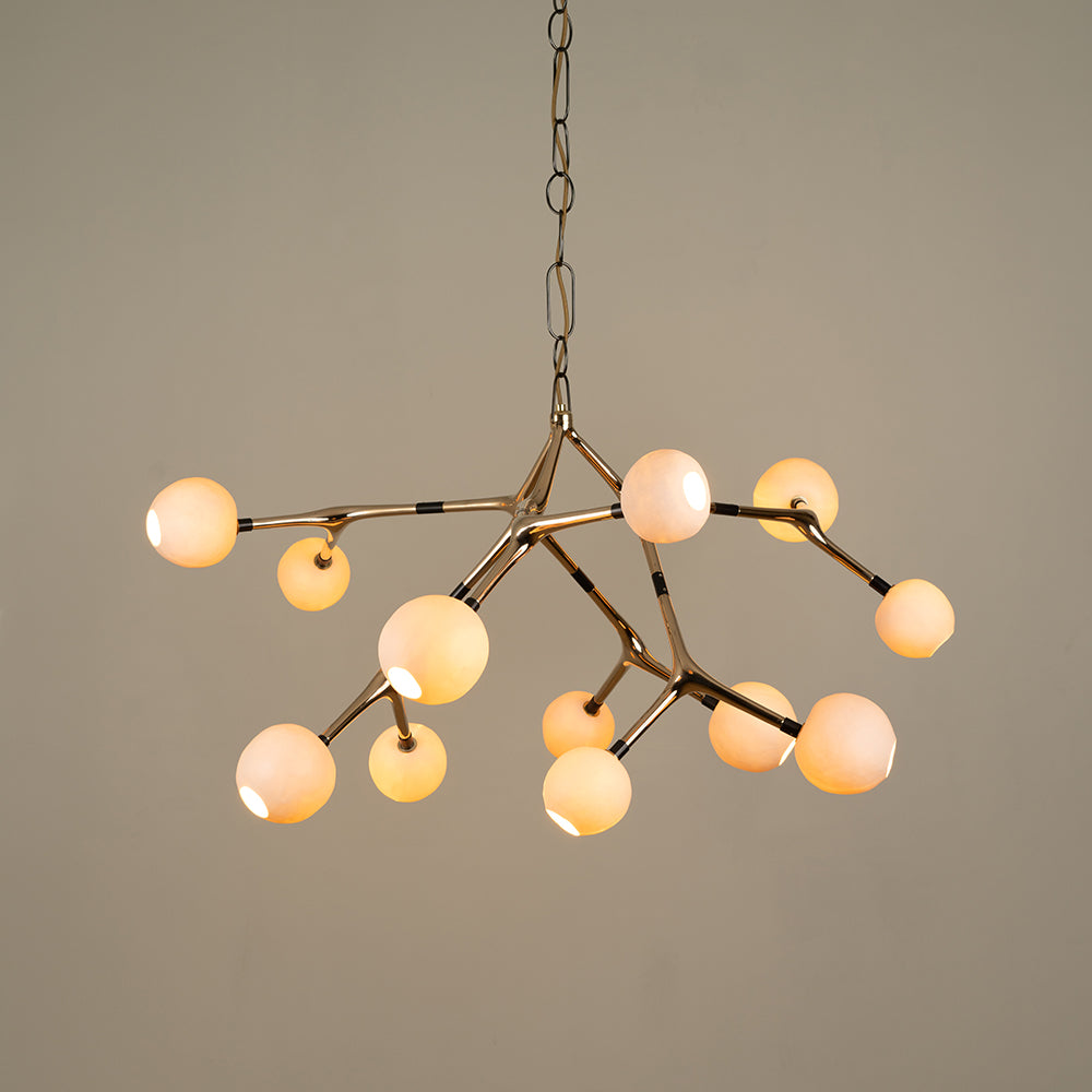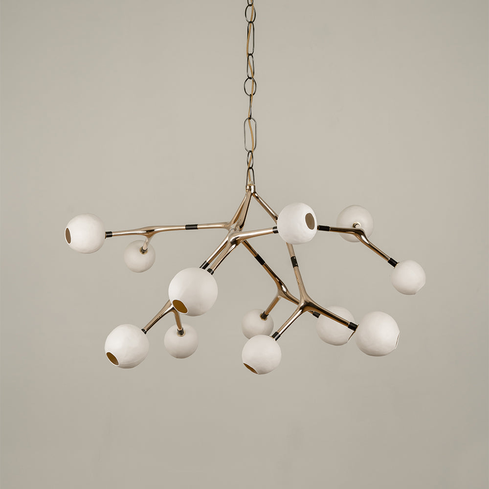 Material: Silicon bronze connection pieces cast in lost wax, blown glass spheres and turned brass fittings.
