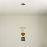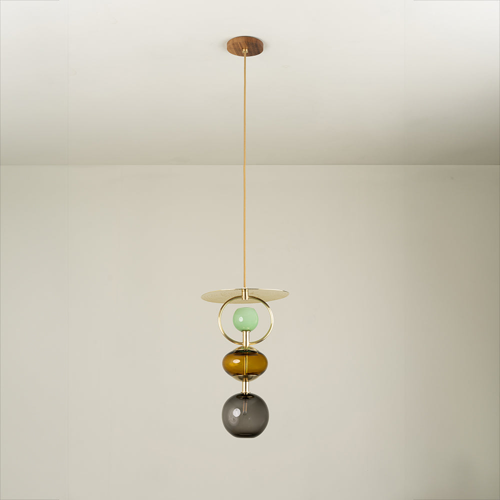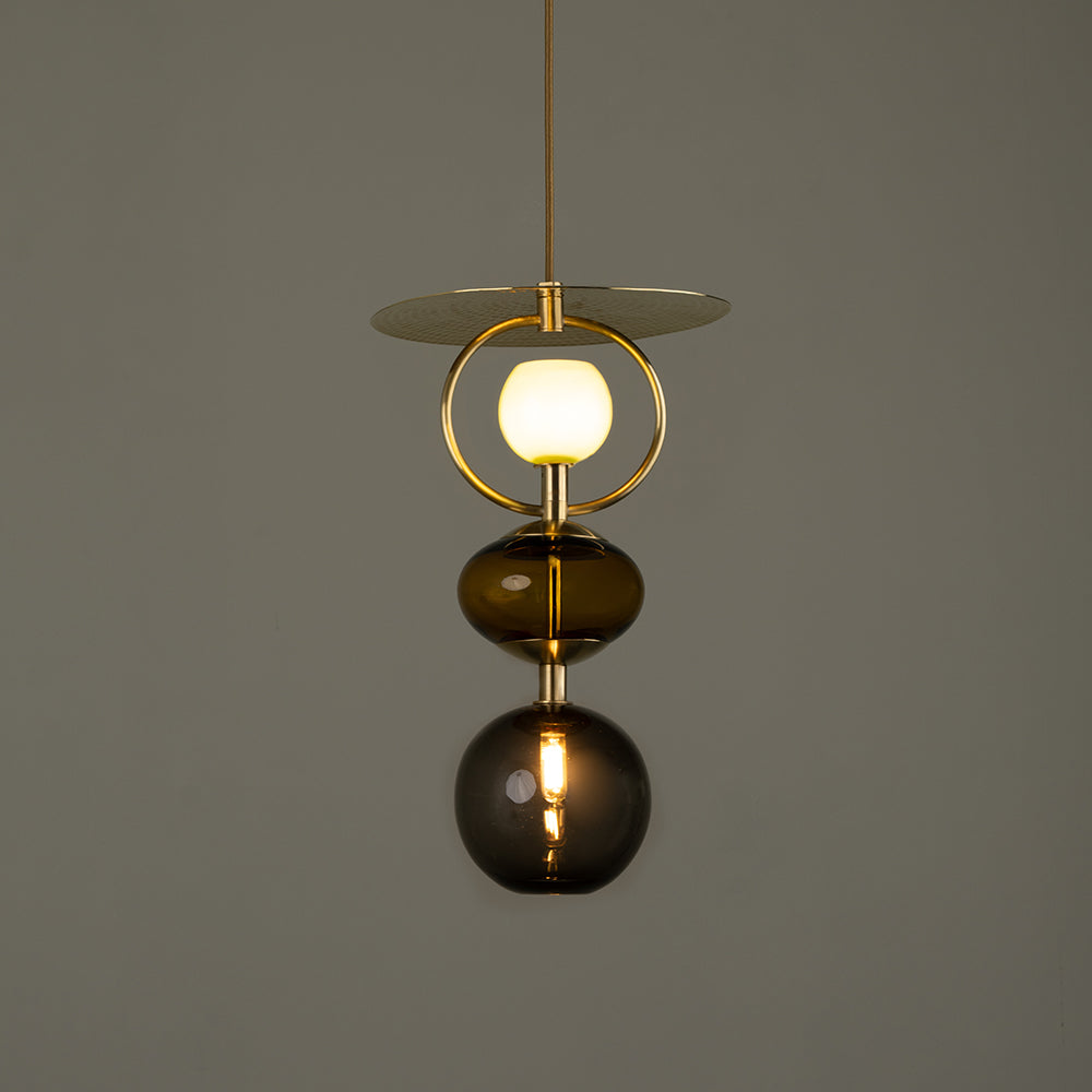 Material: Forged brass parts, turned and brushed brass parts, amber, red and smoke blown glass spheres.