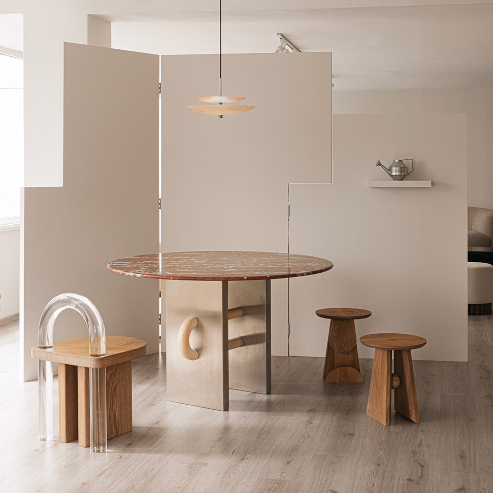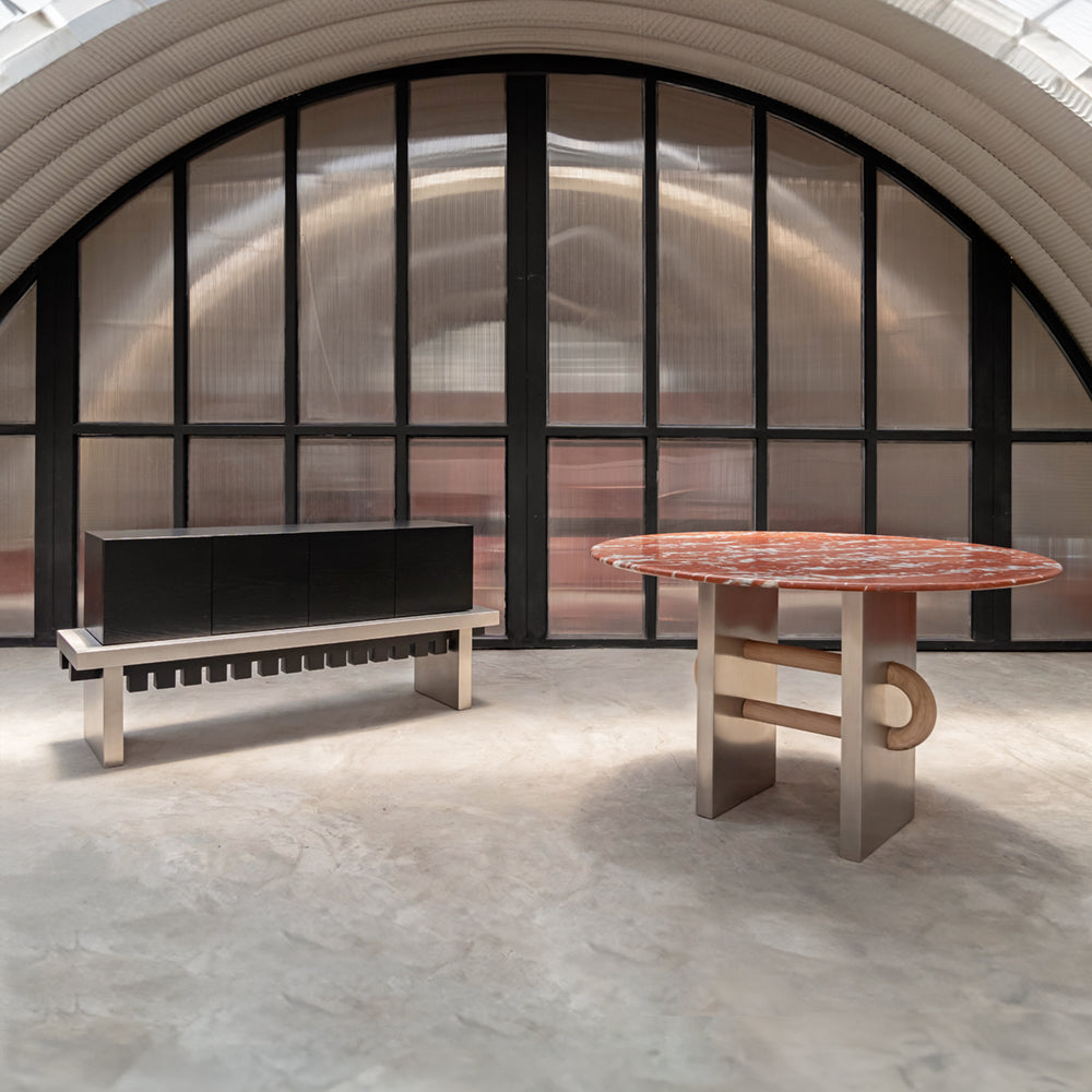 Los tlamemes eran las personas responsables de cargar en sus espaldas el tributo que había que llevar desde los pueblos hasta la gran Tenochtitlan. Esta serie de piezas de Andrés Gutiérrez está inspirada en ilustraciones del Códice Mendoza, mezclado con el estilo Memphis de los años 80.