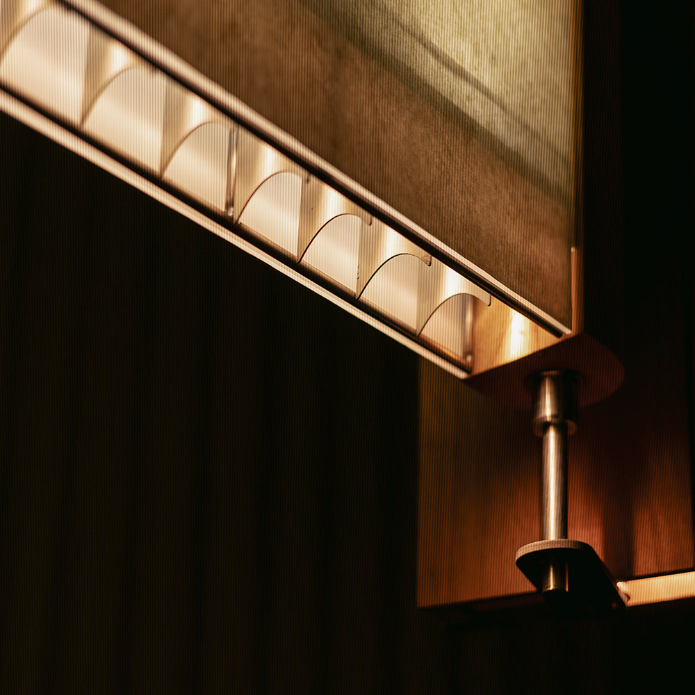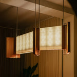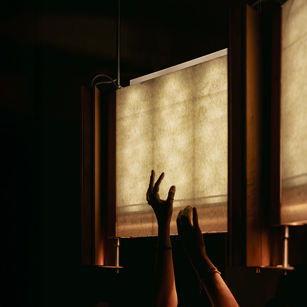 Material: Madera de cedro, herrería en acero inoxidable, pantalla de acrílico con papel haini kozo japonés.