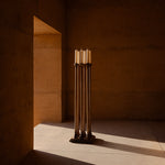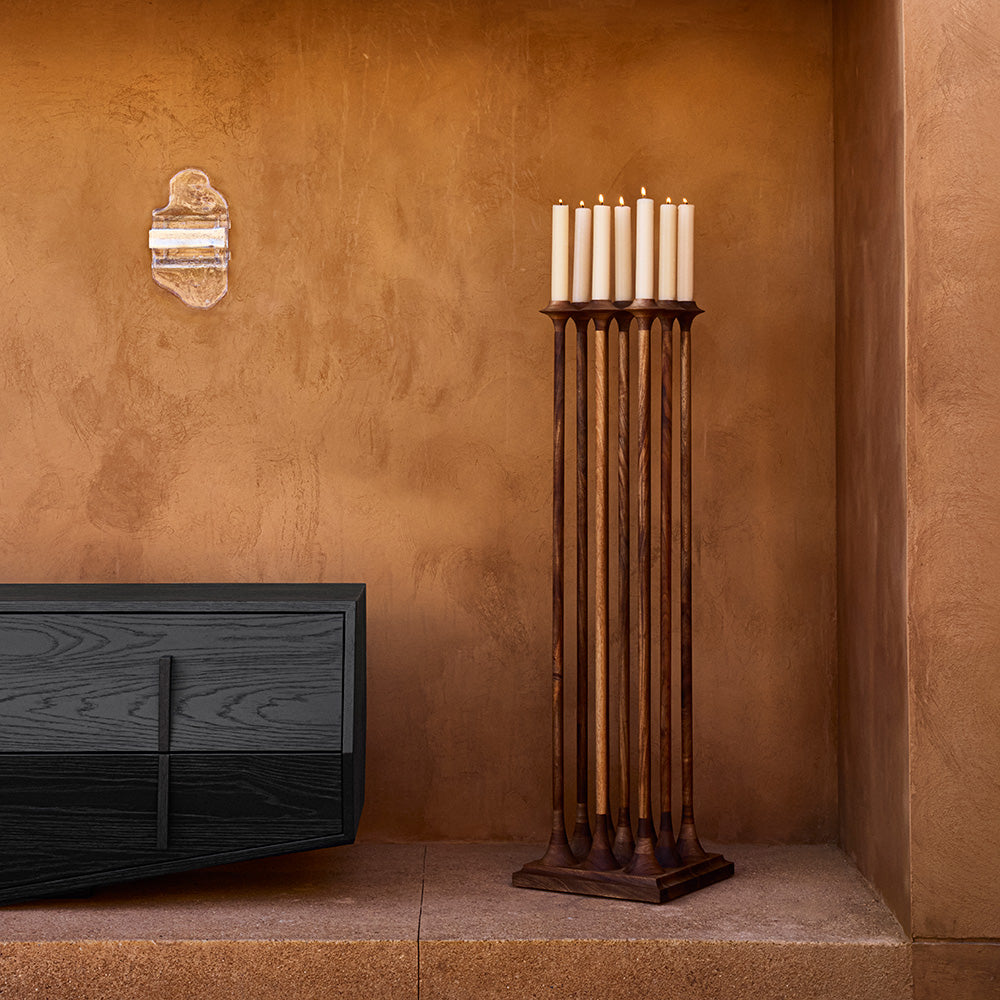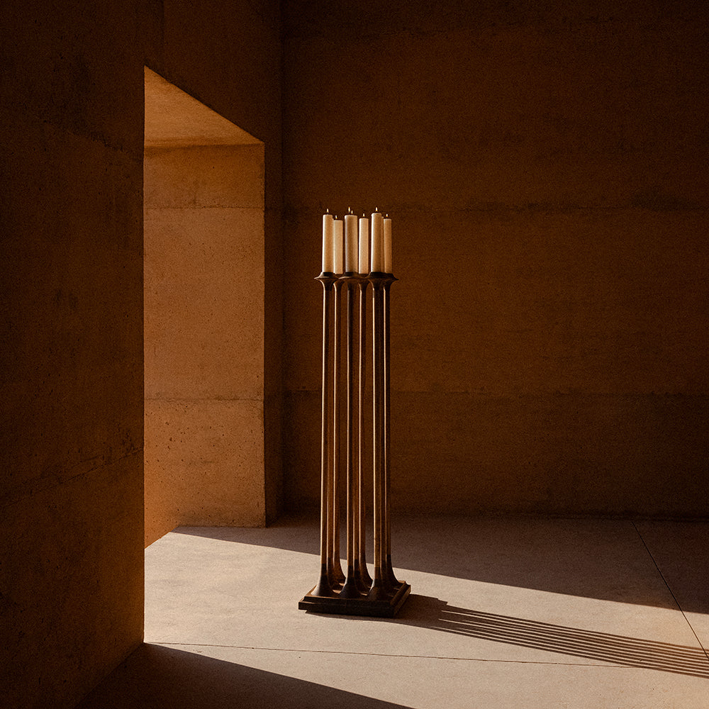 Candelabrum reinterpreta el espíritu del diseño setentero desde una mirada contemporánea, elevando la vela del plano horizontal para convertirla en un gesto espacial. Su forma silenciosa ordena el entorno a través de la verticalidad y la sombra, mientras la llama se vuelve un elemento escultórico que dialoga con la arquitectura. Una pieza donde lo funcional y lo ceremonial se encuentran, creando una atmósfera cálida, íntima y contemplativa.