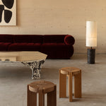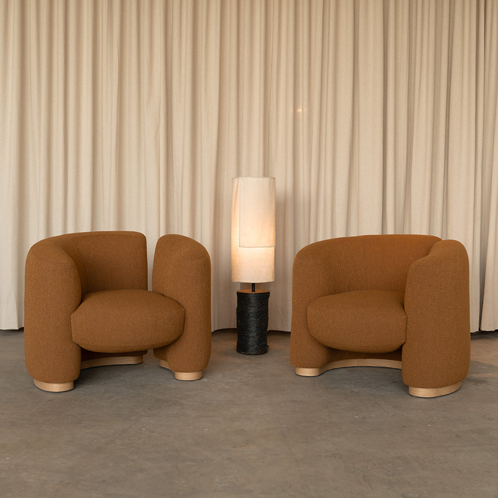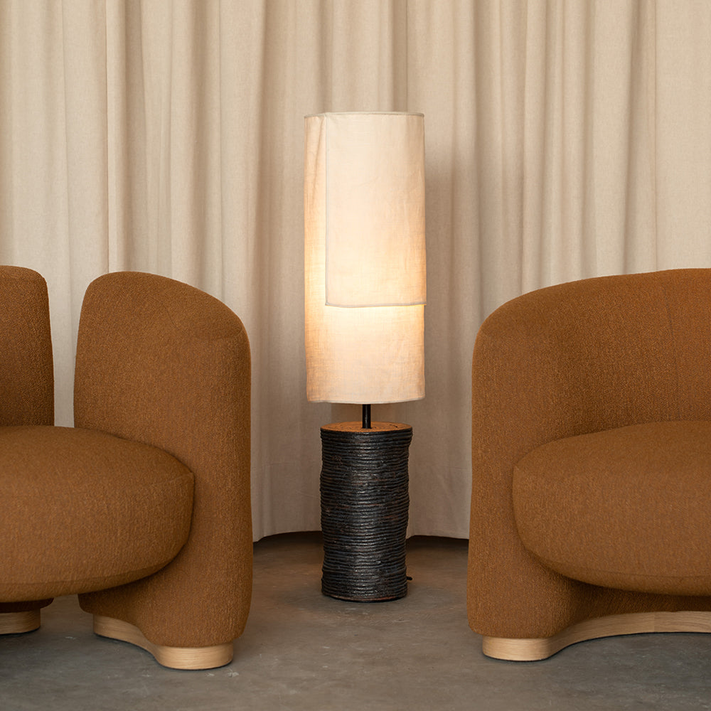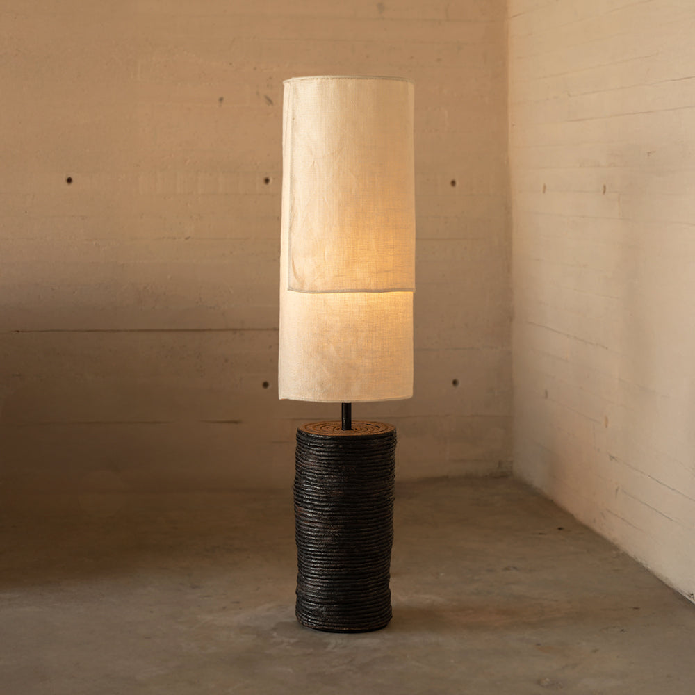 Material: Pantalla de lino, herrería negra y base hecha a mano por barro terracotta usando la técnica tradicional para crear rollos moldeados a mano y cubriéndolos con polvo de bronce. Incluye 2 metros de cable.