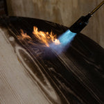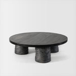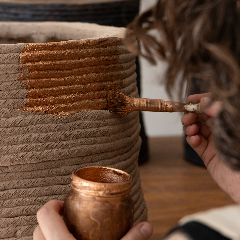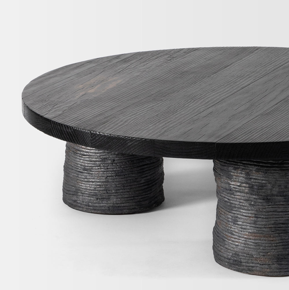 Material: Cubierta de madera carbonizada y patas hechas a mano por barro terracotta usando la técnica tradicional para crear rollos moldeados a mano y cubriéndolos con polvo de bronce.