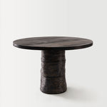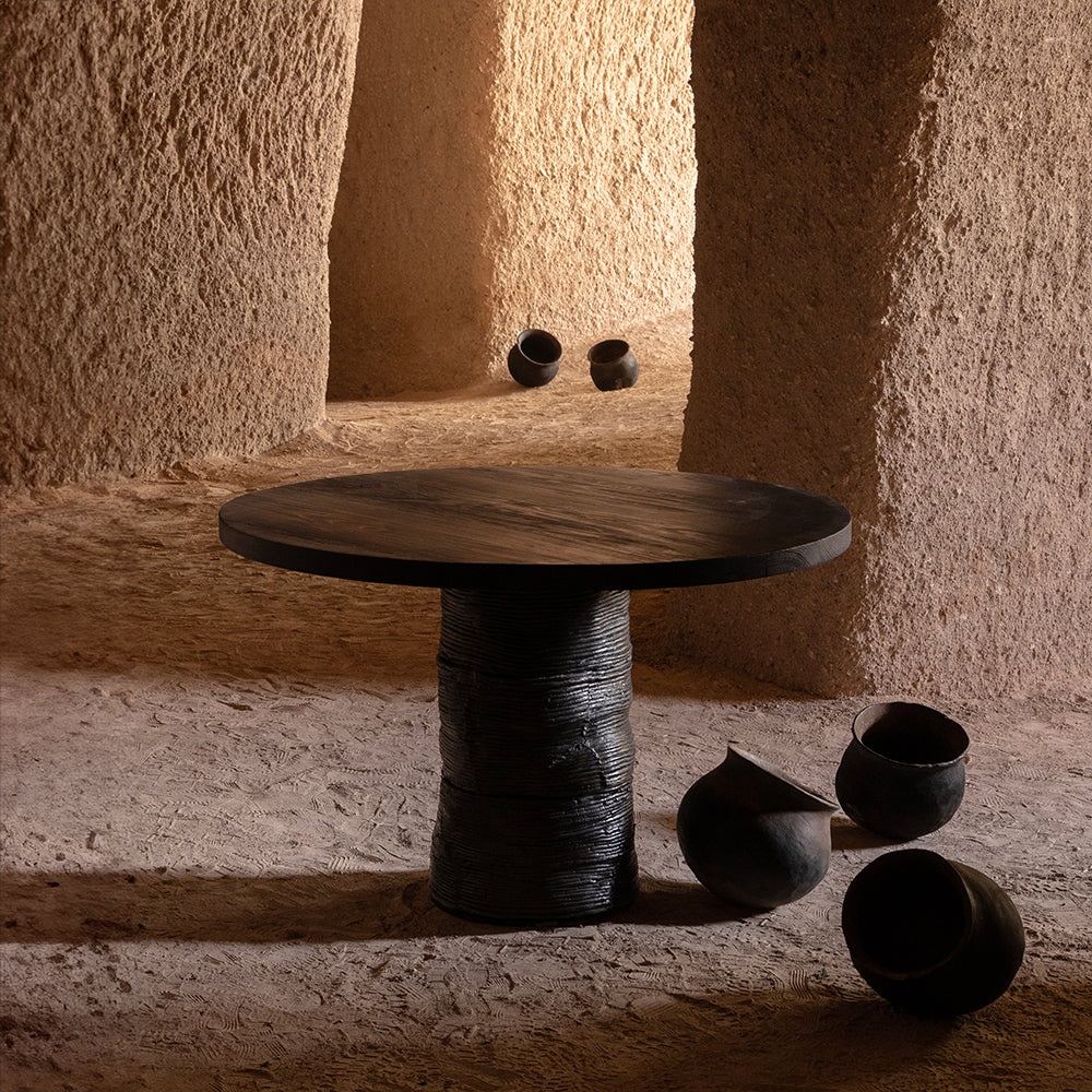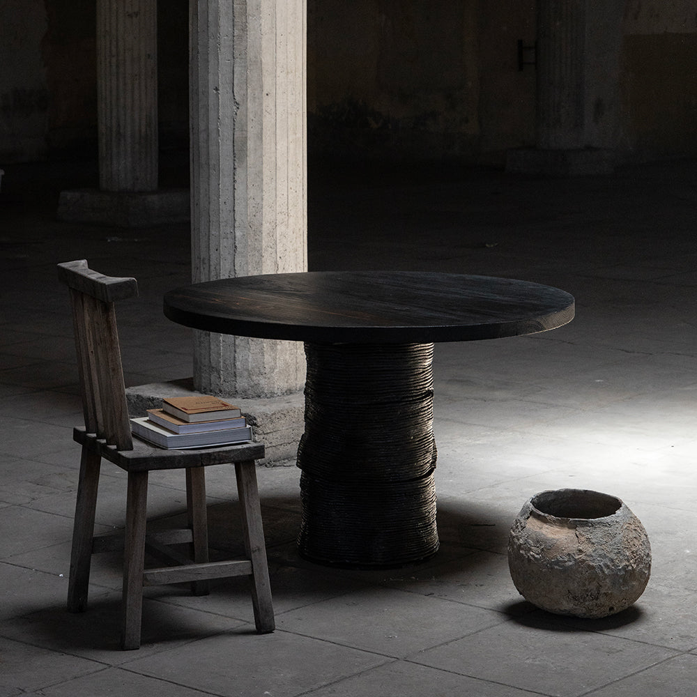 Material: Cubierta de madera carbonizada y base hecha a mano por barro terracotta usando la técnica tradicional para crear rollos moldeados a mano y cubriéndolos con polvo de bronce.