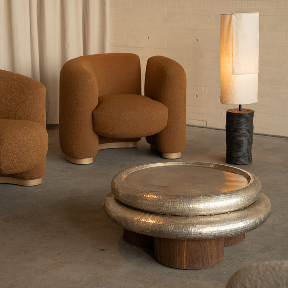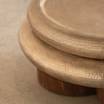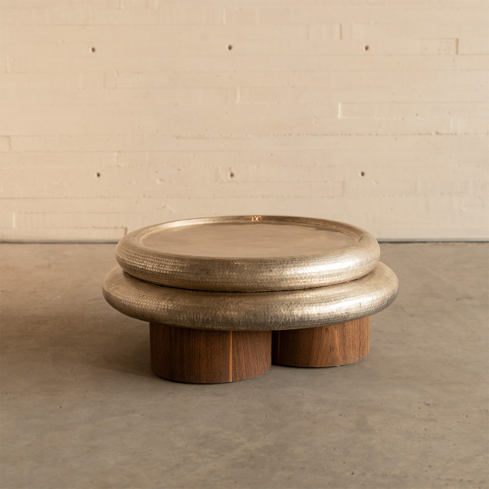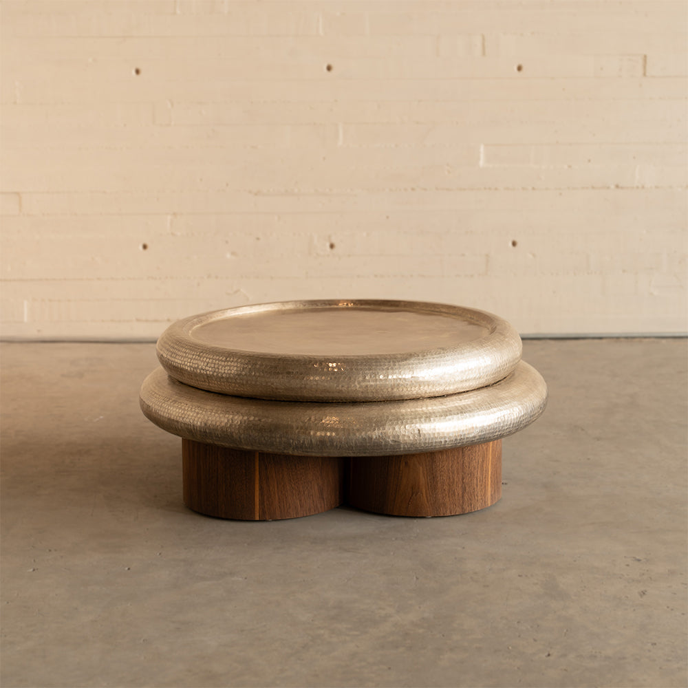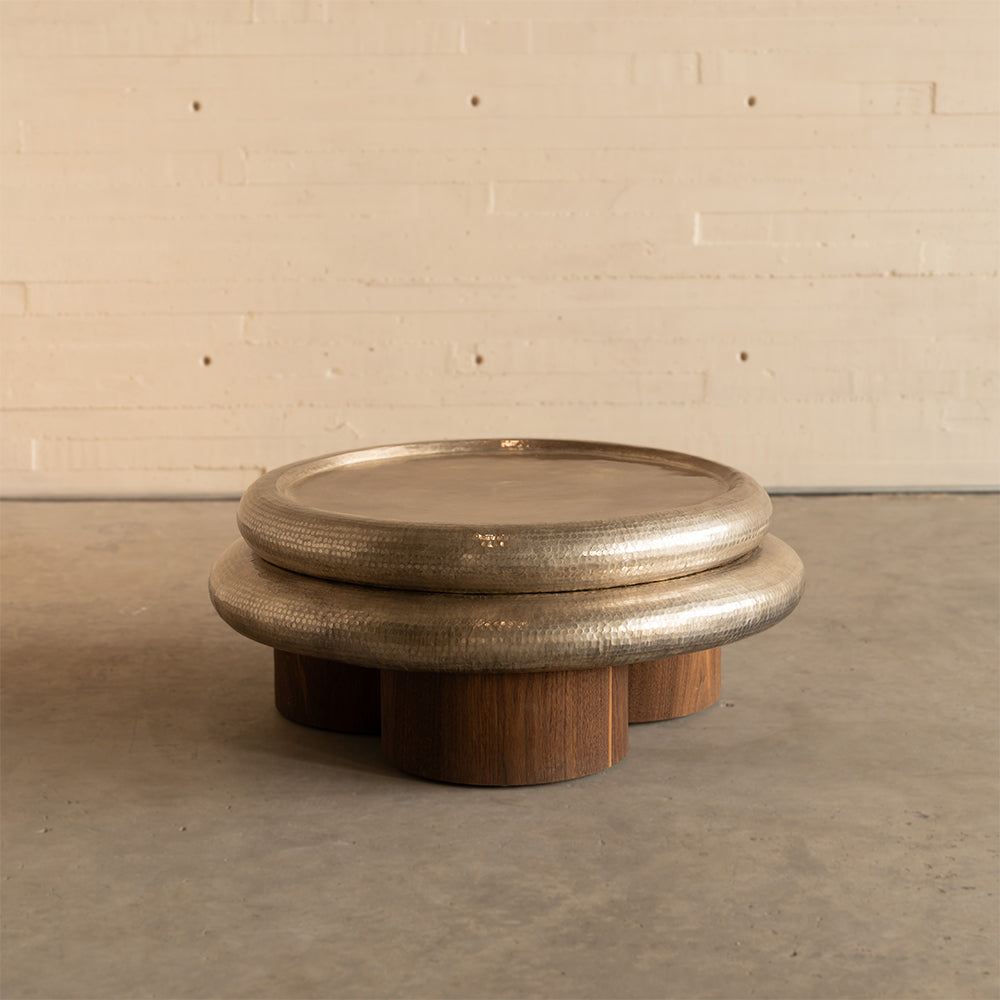 Material: Cubierta en cobre martillado acabado en baño plateado y patas en chapa de nogal.